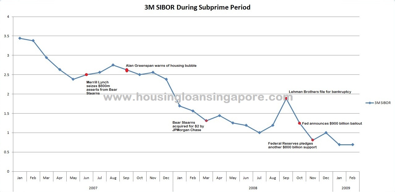 SIBOR can be affected by global financial performance. Here is a chart detailing 3 month SIBOR movements during the period of the USA subprime crisis.